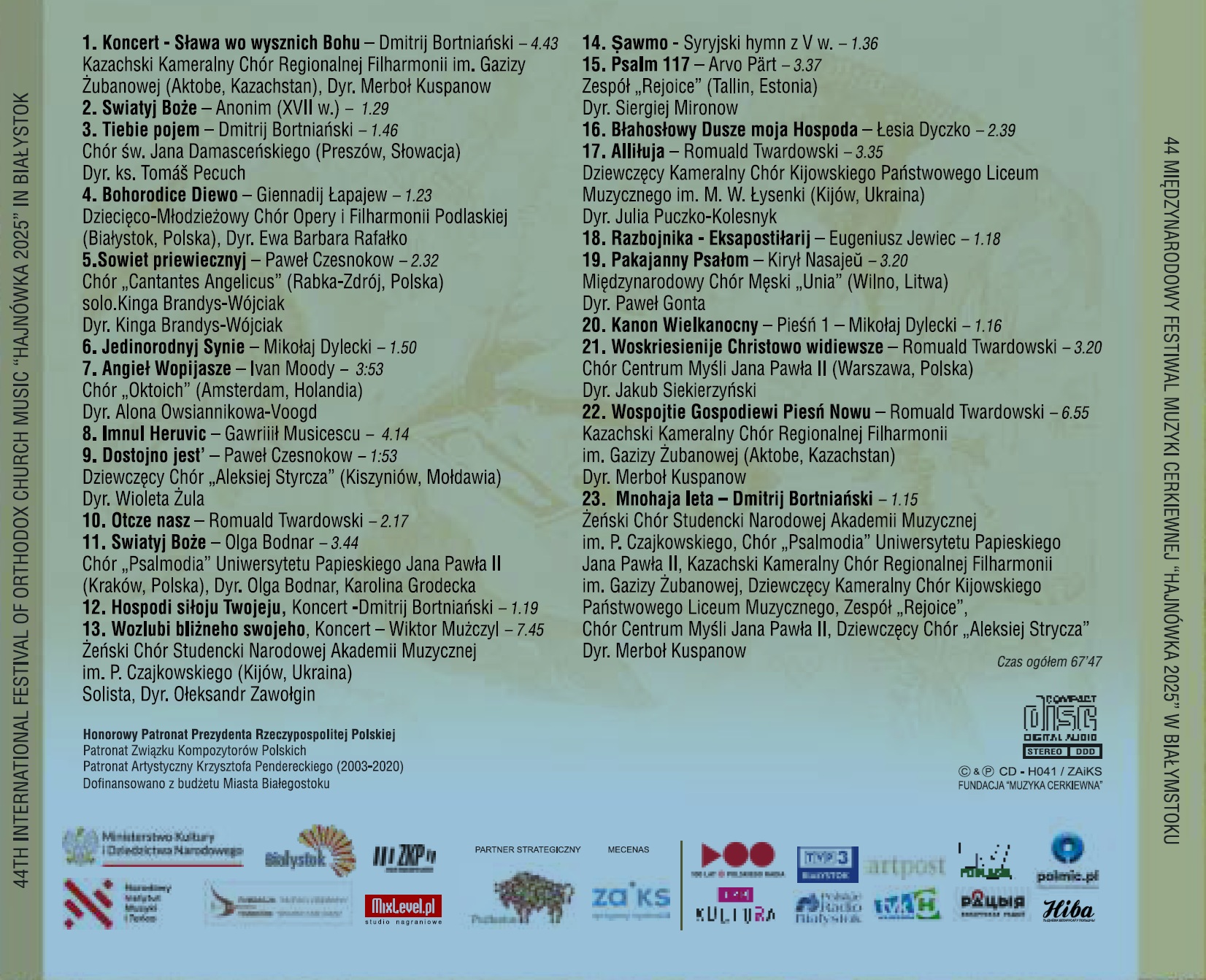 church musie: from sources, to modernity”. It was this kind of musie, performed by choirs from Bułgaria, Estonia, Greece, Kazakhstan, latvia, Moldova, Romania, Ukrainę, and USA, that could be heard within the framework of the festival competition. There were also performances by a choir from Belarus and Poland. Our singers performed the opening Concert of the event organized on the 90th birthday of a great friend of the event, Krzysztof Penderecki – who has served as the Festival’s Artistic Patron sińce 2003. The concert titled „Sacrum of East and West in Krzysztof Penderecki’s choir musie” was dedicated to His memory. The Maestro’s pieces inspired by the musie of West and East Churches were given an excellent performance by the Warsaw National Philharmonic Choir directed by Bartosz Michałowski. The concert’s program was complemented by a composition by John Tavener (on the lOth anniversary of his passing), as well as an incredibly rare musical form in recent times – an Orthodox church musie concert written by Romuald Twardowski. Representatives of Free Belarus who sing in the „Concordia” Choir currently situated in Poland also sang pieces by their composers outside the competition framework. Itis my hope that we will be able to present You both these concerts in separate recordings. The disc I invite You to listen to begins with Byzantine prayers performed by the „Byzantium Ensemble of Athens” founded by many renowned cantors of the Ecumenical Patriarchate. Their Easter Troparion „Chrystos anesti” is followed by a presentation of vocal talent against an excellent droning background – an ison – by conductor and soloist (cantor, teacher, composer, musie theorist, journalist) Georgios Chatzichronoglou. This excellent choir and soloist both introduced us to the wonderful world of Byzantium’s musie. Next, joy, devotion, and a request for God’s protection was expressed in „Hosanna” prayer by the Coptic (according to many historical sources – descendants of the ancient Egyptians and Pharaohs) immigrants from the United States (including clergy), representing one of the oldest – Coptic – Orthodox Churches. Meanwhile, the Christmas piece „Hululo” saw a beautiful performance in Chrisfs language by a female soloist with the Estonian Orthodox Singers’ Ensemble from Tallinn. The recording continues with another prayer. It’s Orthodox church musie of old Rus preserved by Old Believers who, in 17th century, while defending the purity of their sacrament, sought asylum from persecution in Latvia. The next set of performers are girls from Moldova. These musical academy students show female gusto while performing a prayer set to the musie of their countryman – a modern composer and conductor – as well as a fragment of a concert by, so far, the most prominent creator of this kind of musie, who composed at the break of 18th and 19th century – Dmitry Bortniansky. The Romanian Orthodox Church Choir composed of clergy members presented, among others, two particular pieces during the competition: „Alleluja” set to musie of their native composer Anton Pann – creator of