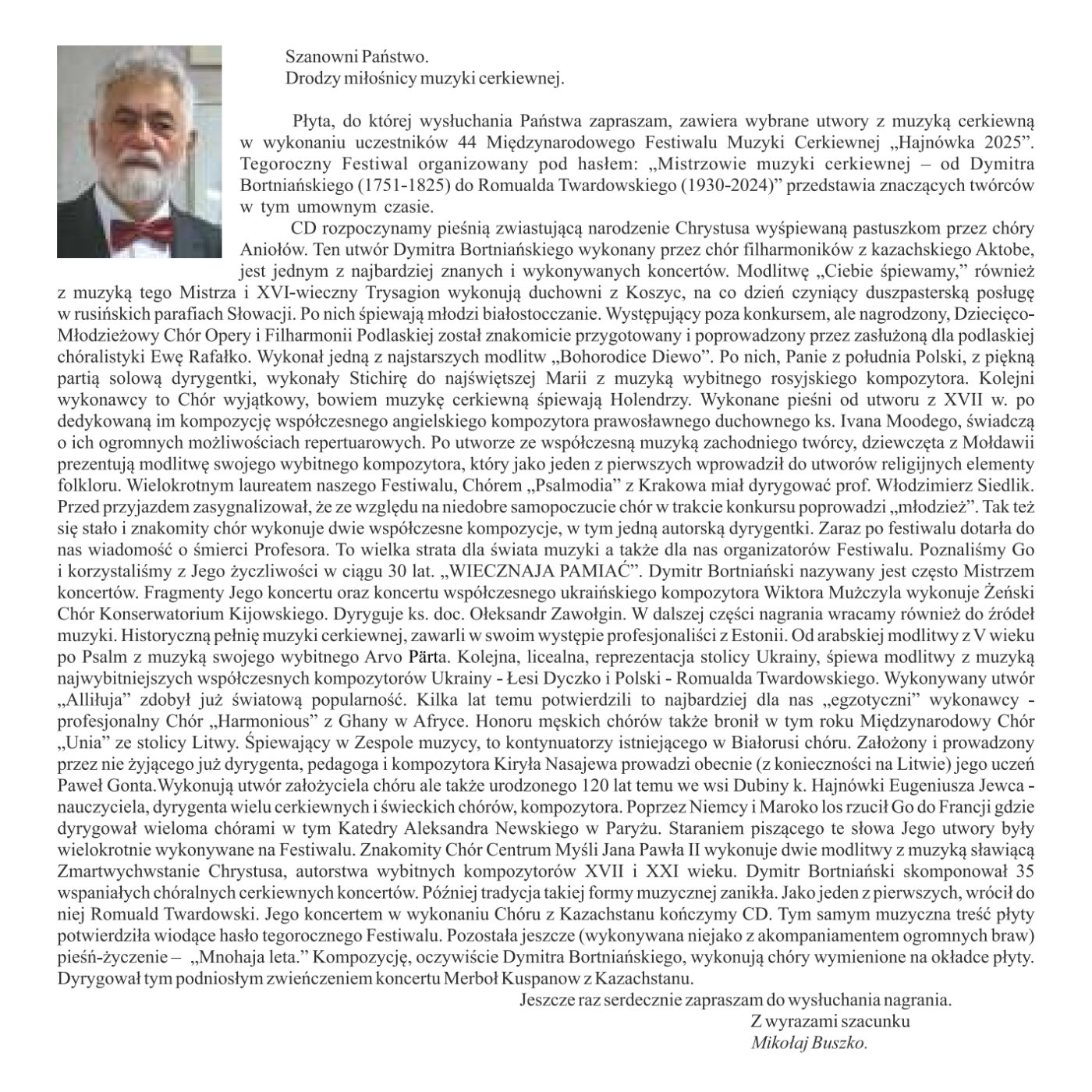 Z nadzieją, że Koncert spodoba się również Państwu i wyrazami najwyższego szacunku. Mikołaj Buszko