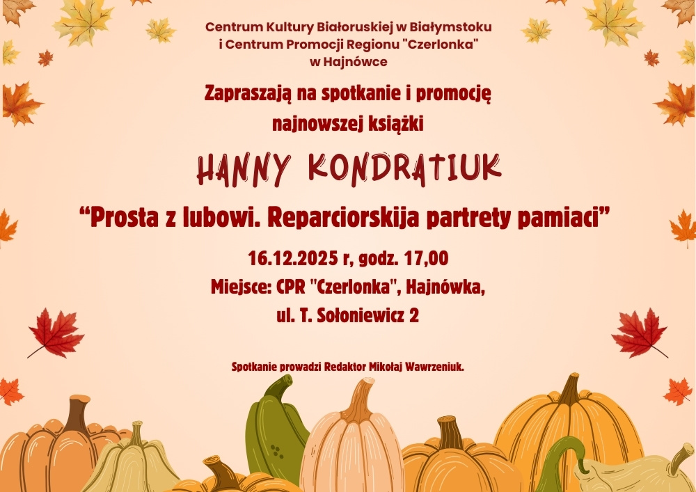 Centrum Kultury Białoruskiej w Białymstoku i Centrum Promocji Regionu „Czerlonka” w Hajnówce zapraszają na spotkanie i promocję najnowszej książki “Prosta z lubowi. Reparciorskija partrety pamiaci” Hanny Kondratiuk